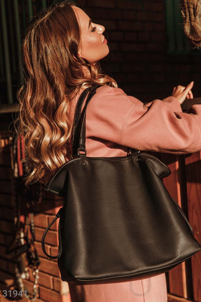 Стильная черная сумка с нерегулируемыми короткими ручками и затяжками по бокам, выполненная из матовой эко-кожи: большой вместительный карман на магнитной кнопке с тремя отделениями и боковыми карманами, одним наружным на контрастной молнии. ,