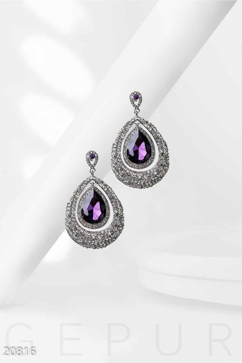 Яркие серьги-гвоздики с двойной подвеской, украшенные большим декоративным камнем.