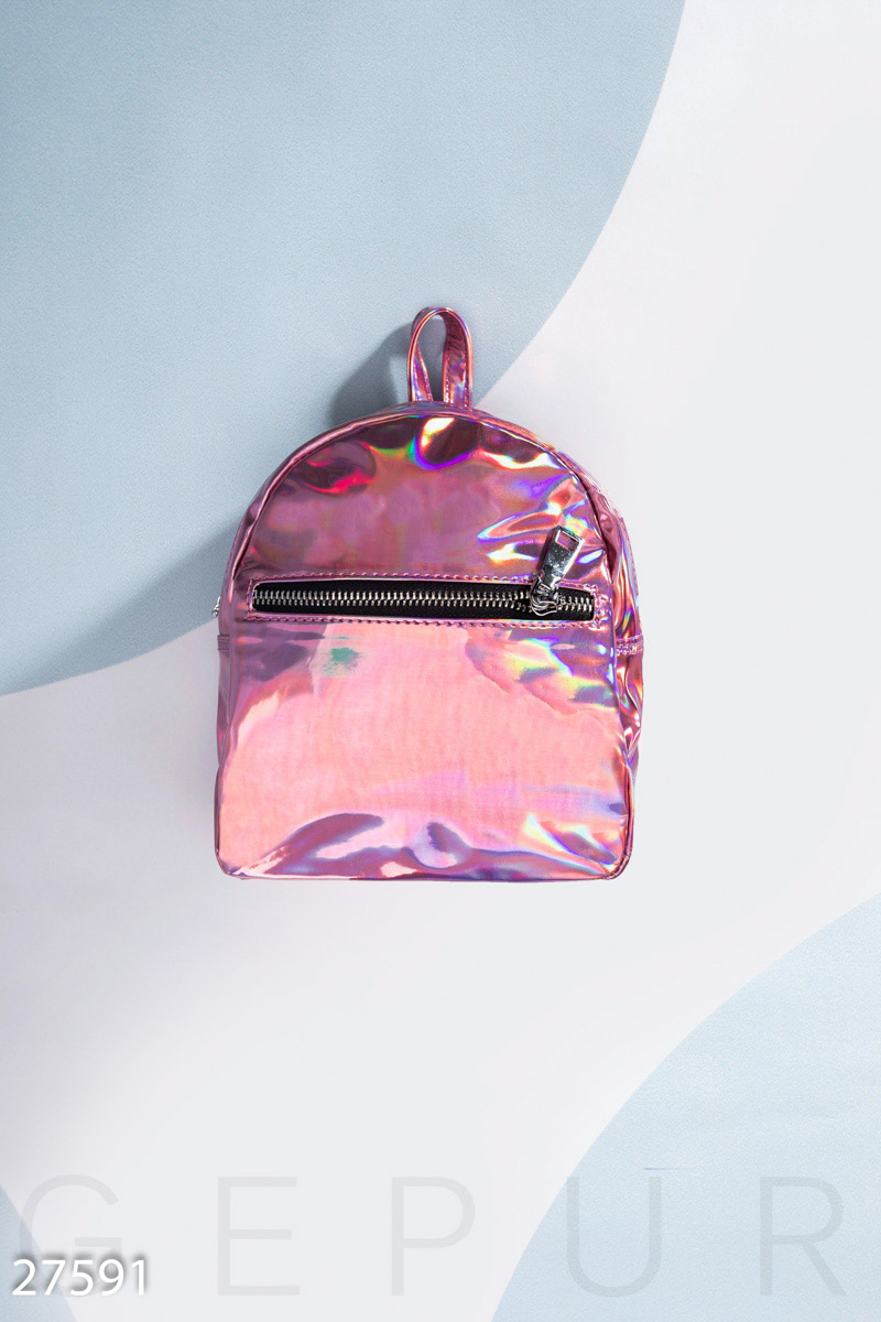 Небольшой рюкзак из лаковой эко-кожи, с наружным карманом на молнии и узкими регулируемыми лямками.