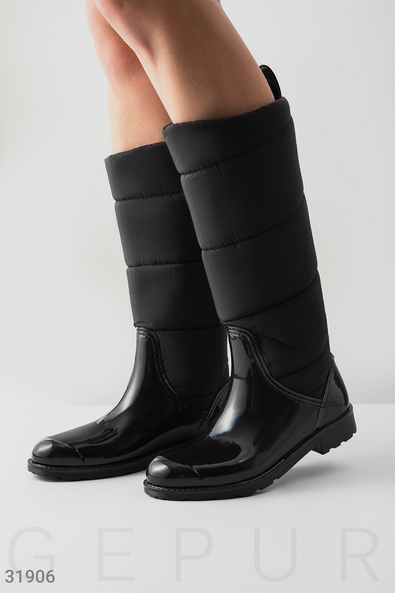 Высокие резиновые сапоги на флисовом подкладе по всей длине и со стеганым голенищем.