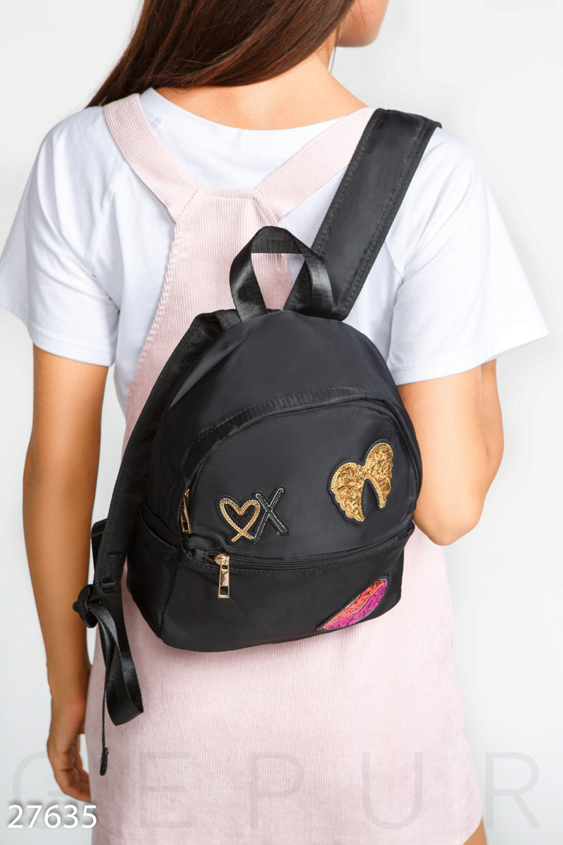 Компактный рюкзак с цветными нашивками, выполненный из плотной ткани с водоотталкивающей пропиткой: вместительный карман на молнии, два открытых кармана по бокам, короткая ручка и широкие лямки с регулятором длины.