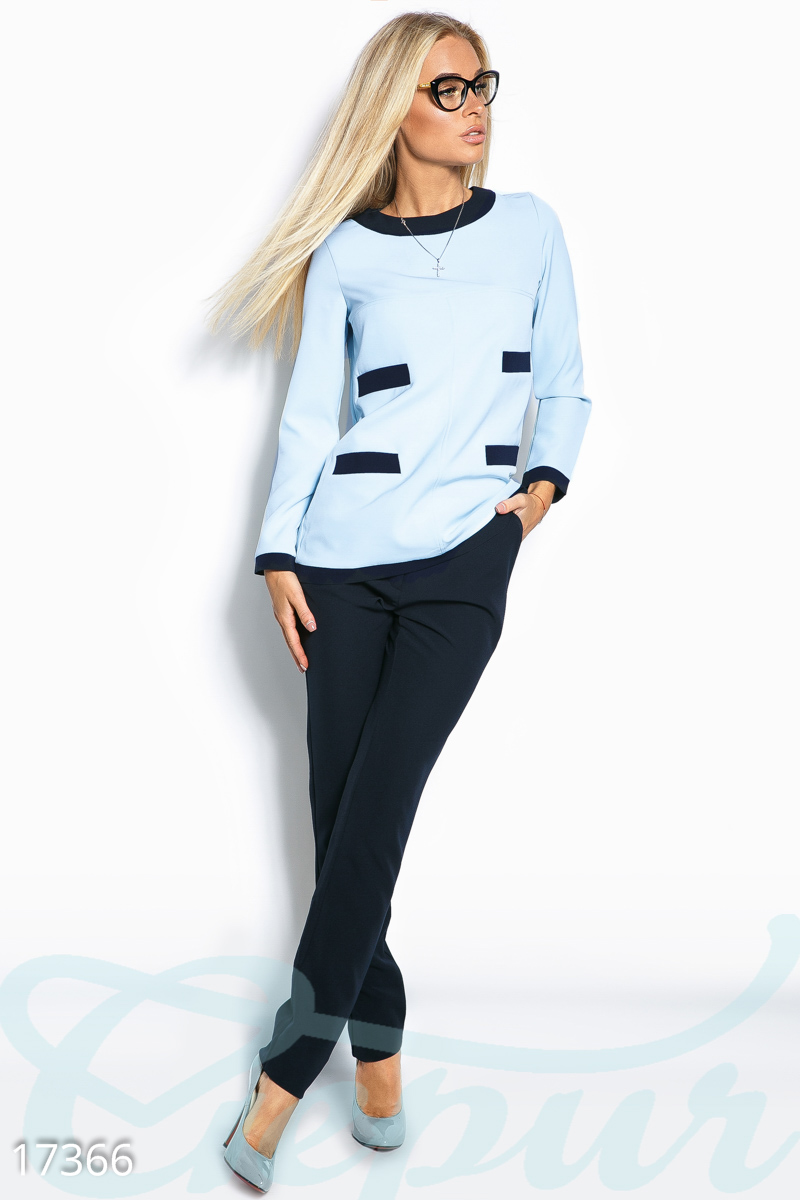 Стильный женский костюм, выполненный из двухцветной костюмной ткани: лаконичная блуза с контрастным кантом и зауженным рукавом ¾, облегающие брюки средней посадки с двумя прорезными карманами по бокам.