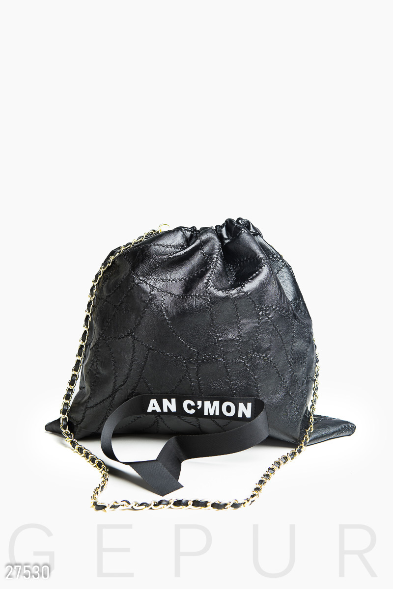 Трендовая женская сумка-мешок, выполненная из мягкой эко-кожи с фигурной строчкой. Сумка дополнена репсовой лентой на лицевой стороне и съемным плечевым ремешком-цепочкой.