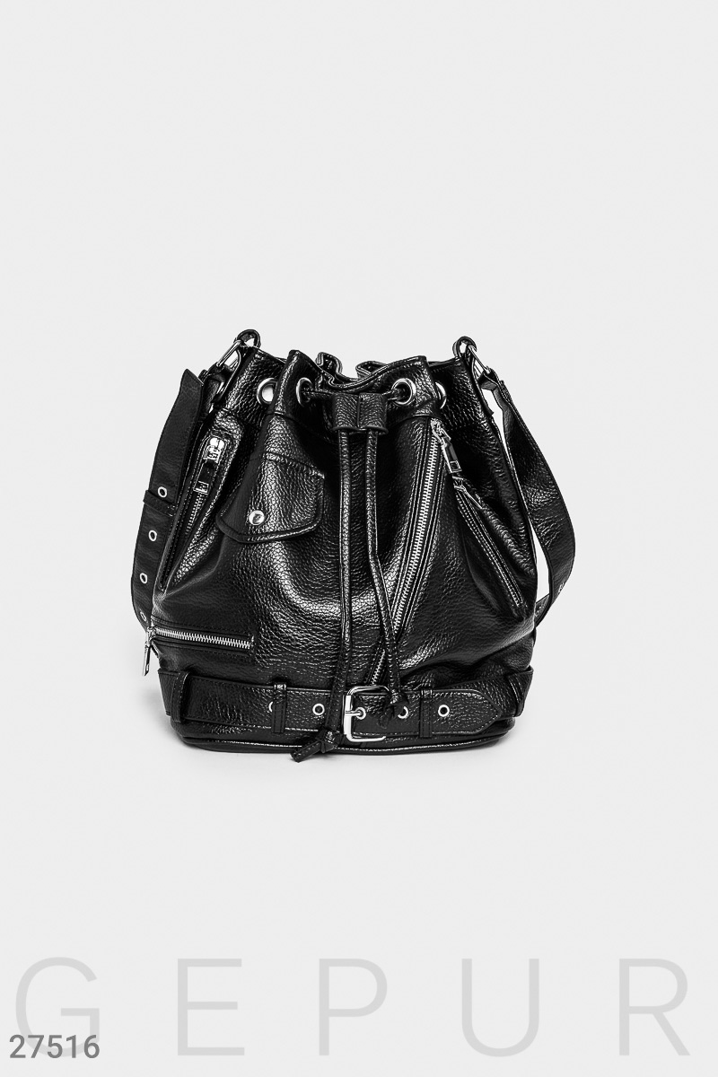 Трендовая женская сумка-мешок, выполненная из мягкой эко-кожи, с кулиской и на магнитной кнопке, пряжкой снизу, тремя декоративными карманами спереди, двумя прорезными на молнии и регулируемым ремешком на плечо. Внутри одно вместительное отделение с двумя небольшими открытыми карманами и боковым на молнии.