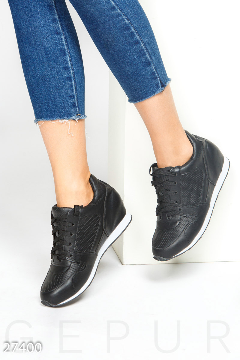 Кроссовки-сникерсы на невысокой танкетке, выполненные из качественной эко-кожи.