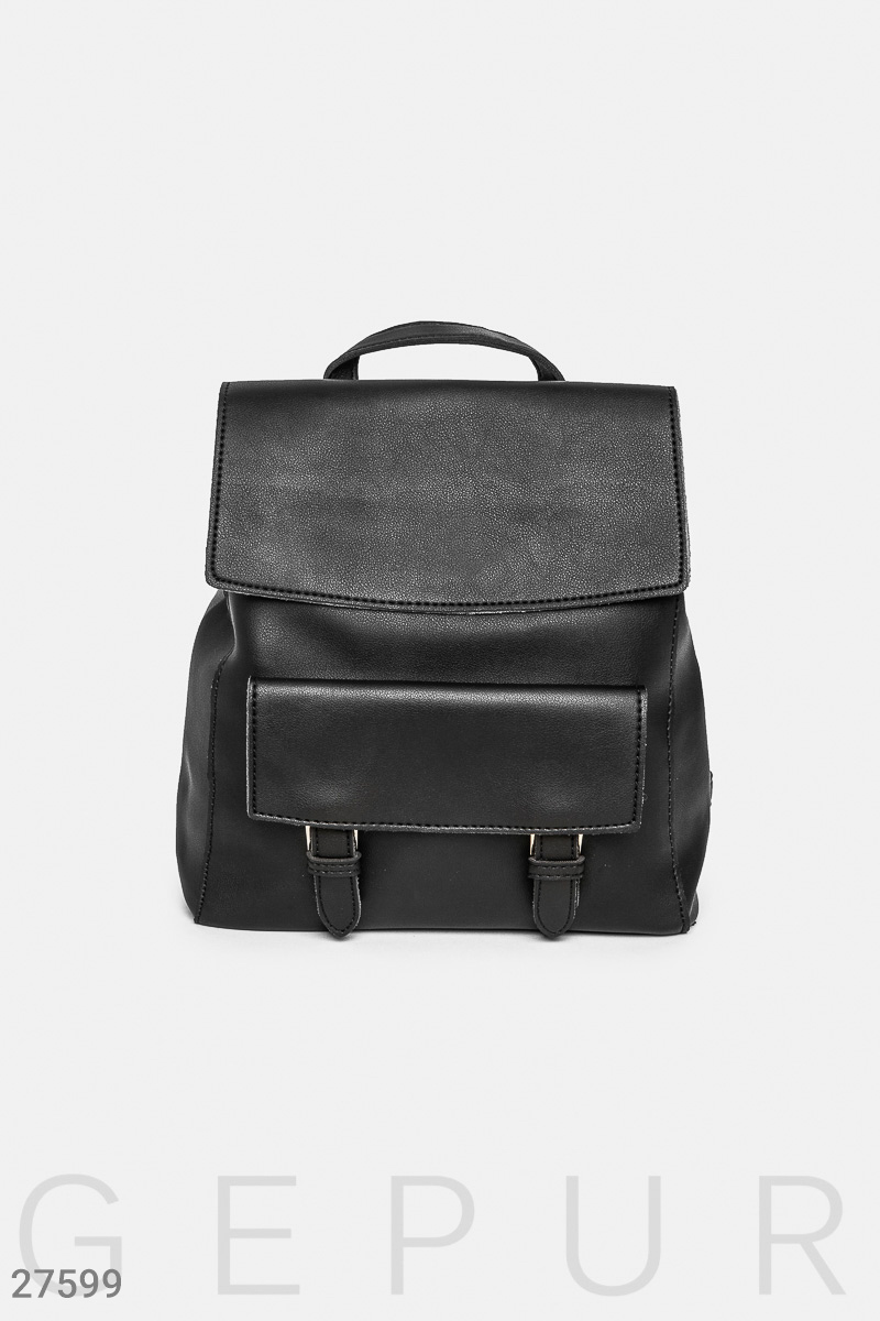 Стильный рюкзак с клапаном, карманом с декоративными пряжками и узкими лямками, которые трансформируются в плечевой ремешок.