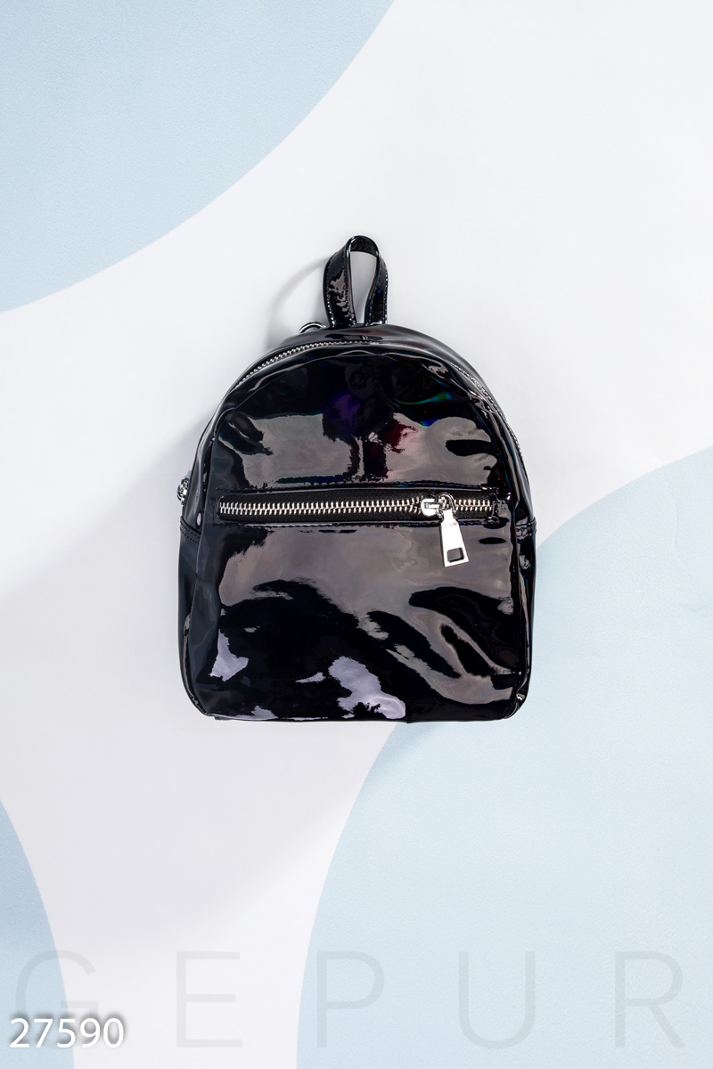 Небольшой рюкзак из лаковой эко-кожи, с наружным карманом на молнии и узкими регулируемыми лямками.