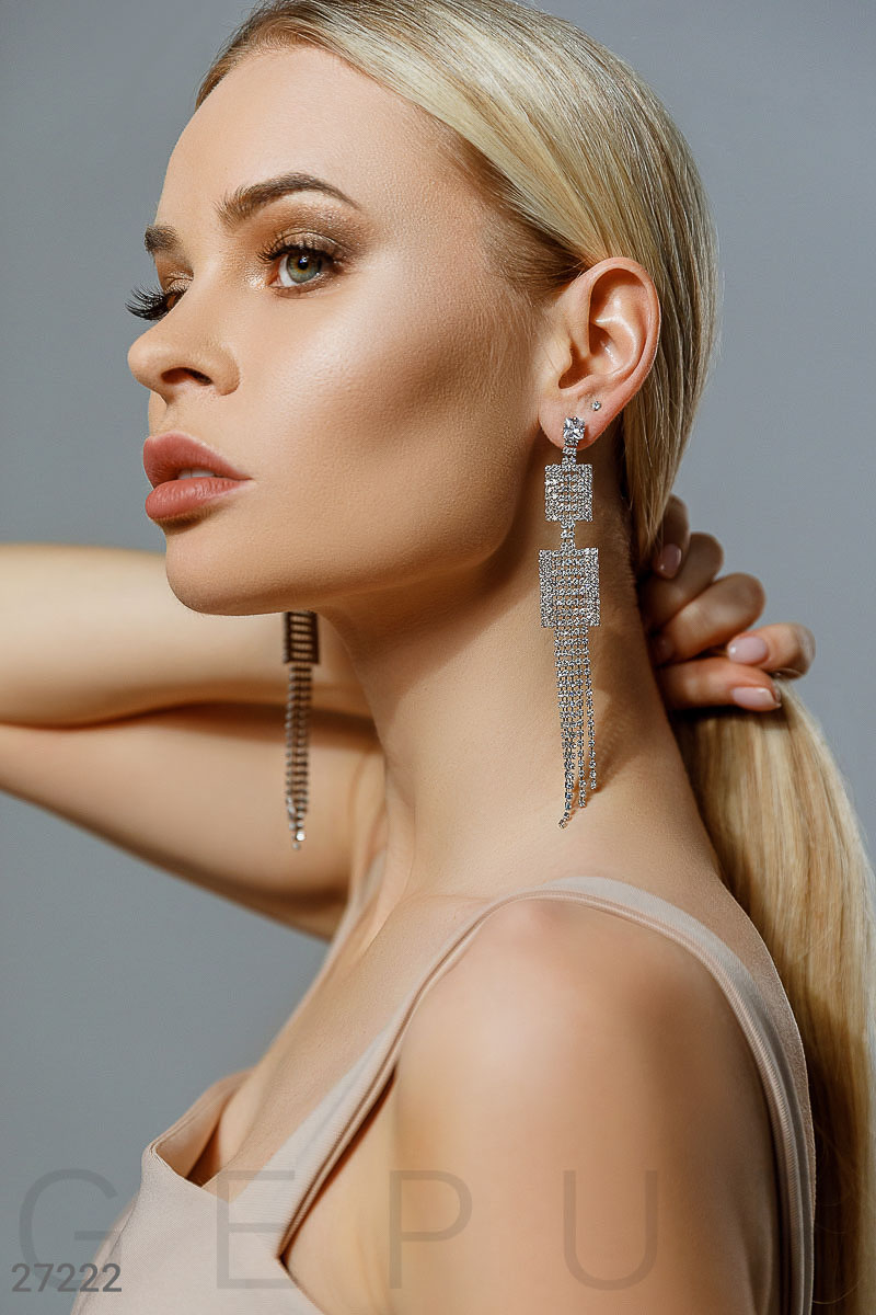 Утонченные вечерние серьги-подвески с застежкой-пусета, украшенные искусственными камнями.