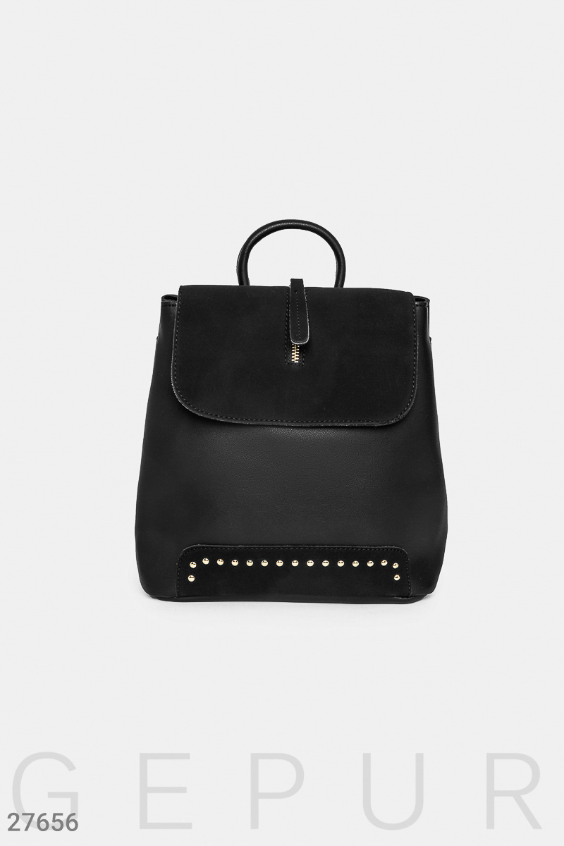 Трендовый городской рюкзак из эко-кожи с застежкой-клапаном, украшенной декоративной молнией, регулируемыми лямками, небольшим карманом на молнии сзади, металлическими заклепками спереди и фактурным акцентом на клапане. Внутри три отделения, один открытый карман и два кармана на молнии.