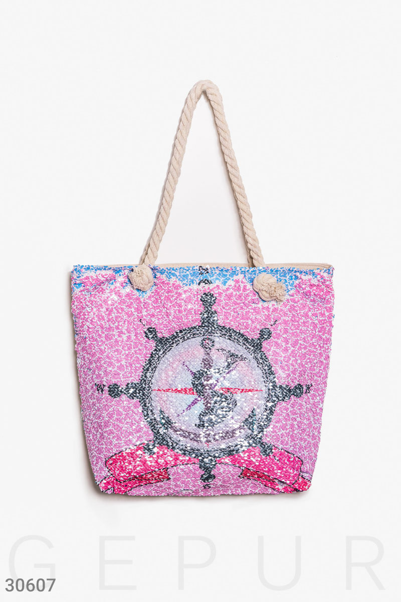 Тематическая летняя сумка из холщовой ткани на подкладе (полиэстер), с практичными ручками-канатами, одним вместительным отделением с боковым карманом, украшенная эффектной двусторонней пайеткой.