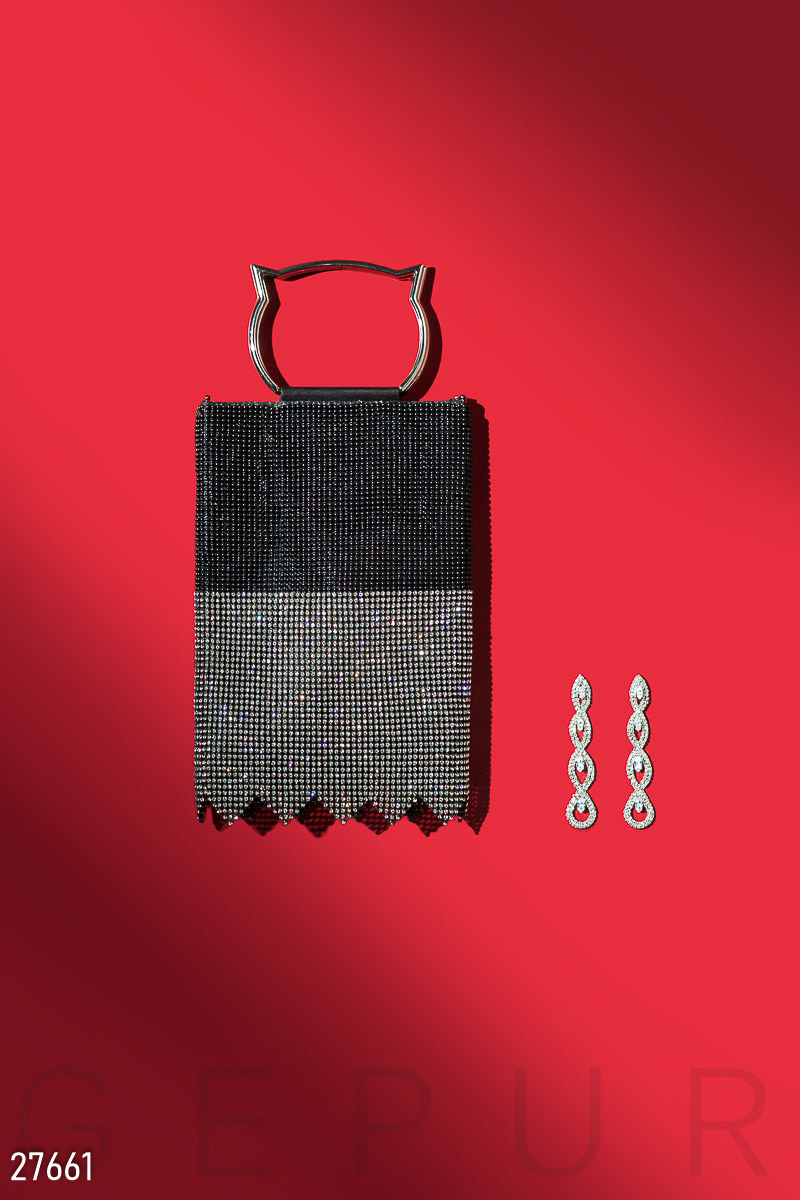 Вечерняя сумка с фигурными металлическими ручками, украшенная бусинами и декоративными камнями.