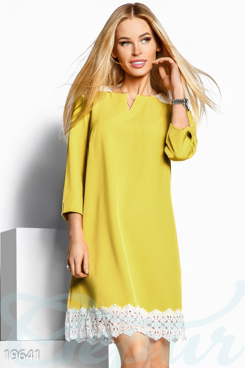 Короткое платье-трапеция с небольшим v-образным вырезом на груди, лаконичным рукавом 3/4 и отделкой контрастным тканным кружевом на плечах и подоле.