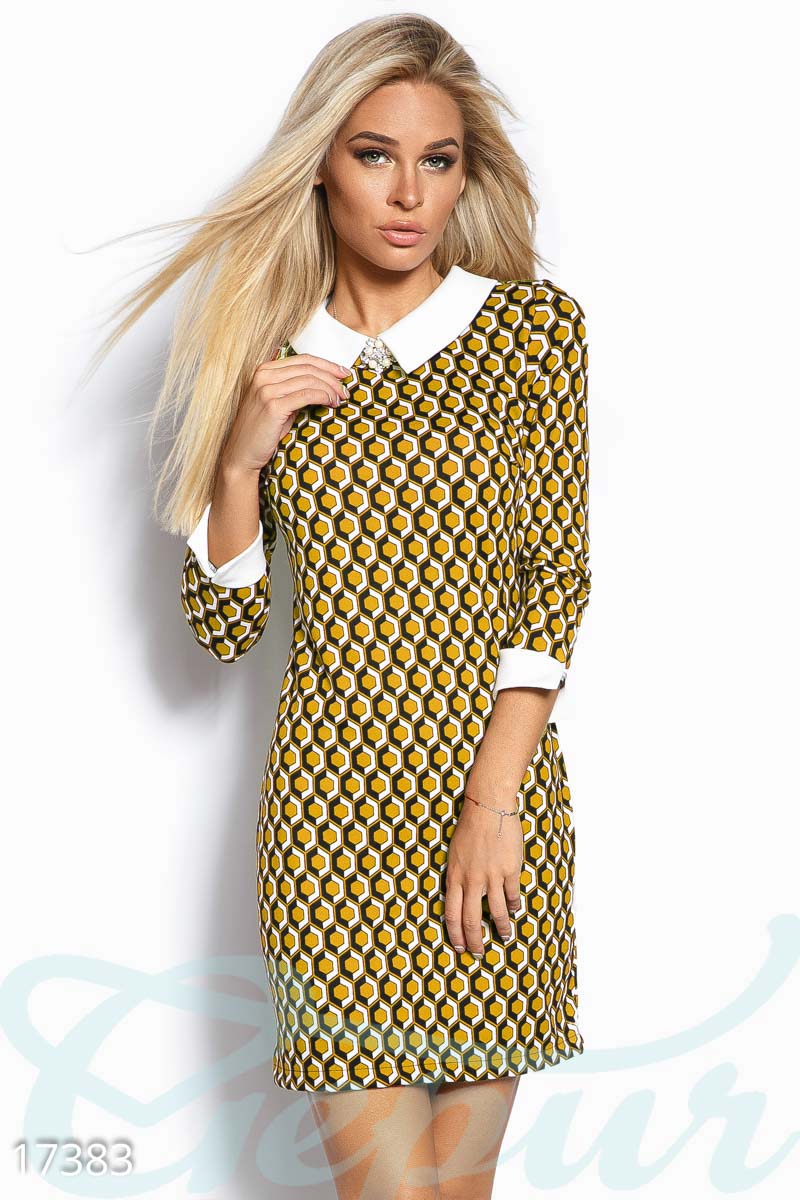 Трикотажное платье, украшенное мозаичным принтом: контрастный отложной воротник и манжеты, съемная брошь с камнями, рукав ¾ и короткая облегающая юбка.