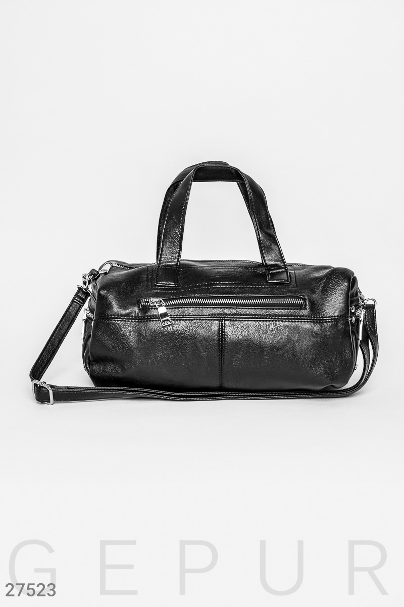 Универсальная повседневная сумка в стиле duffel, выполненная из мягкой эко-кожи: удобные короткие ручки, съемный плечевой ремешок и три боковых кармана на молнии. Внутри одно отделение, два открытых боковых кармана и один с застежкой на молнию.