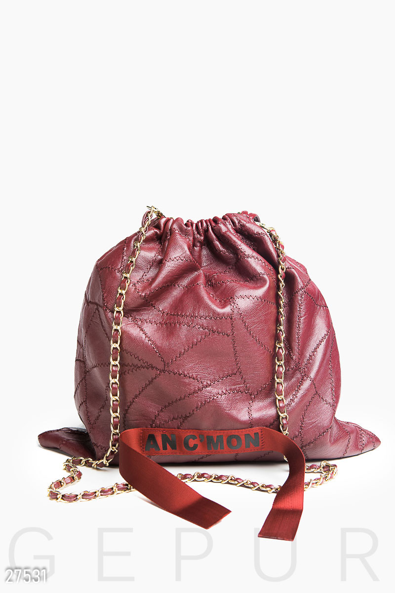 Трендовая женская сумка-мешок, выполненная из мягкой эко-кожи с фигурной строчкой. Сумка дополнена репсовой лентой на лицевой стороне и съемным плечевым ремешком-цепочкой.