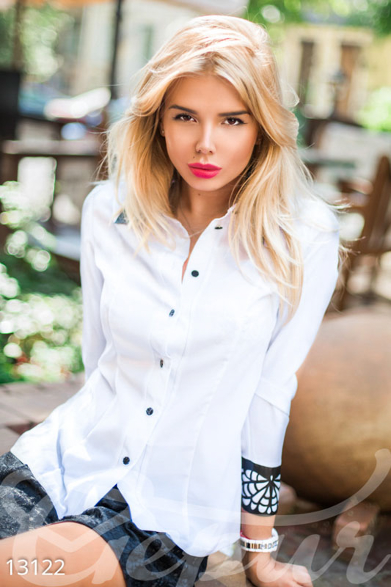 Приталенная рубашка классического кроя с контрастными пуговицами, строгим воротником и манжетами, выполненными из мягкой эко-кожи с фигурной перфорацией.