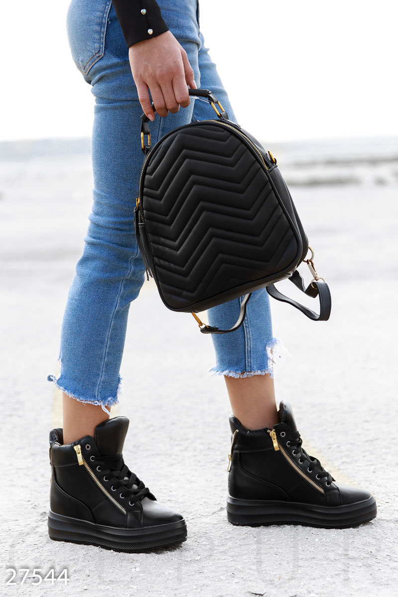 Небольшой женский рюкзак на молнии, выполненный из стеганой эко-кожи. Лямки трансформируются в плечевой ремешок с регулятором длины.