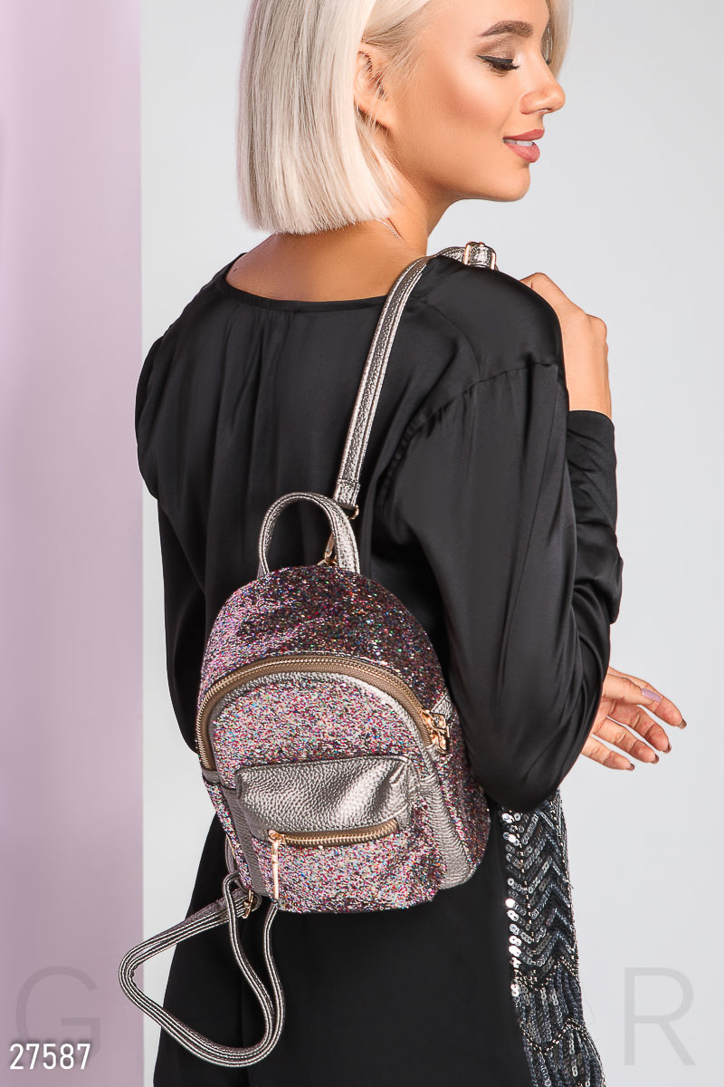 Небольшой рюкзак из фактурной эко-кожи, украшенной глиттерным напылением: карман на молнии, два открытых кармана по бокам и съемные лямки.