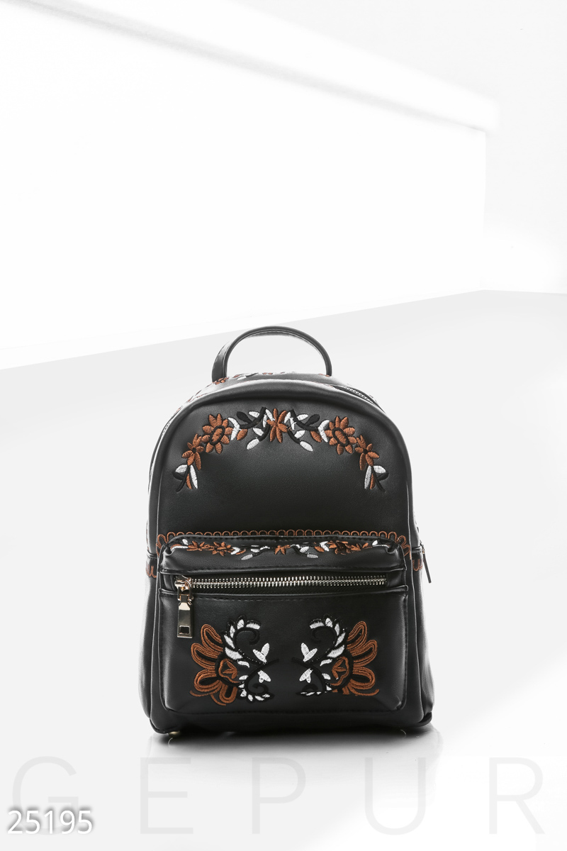 Небольшой рюкзак из мягкой эко-кожи, украшенный цветной вышивкой: накладной карман на молнии, узкие регулируемые лямки и металлические заклепки.