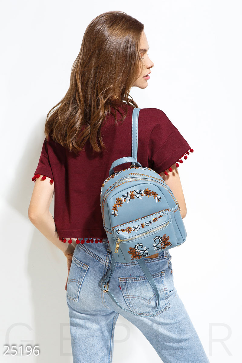 Небольшой рюкзак из мягкой эко-кожи, украшенный цветной вышивкой: накладной карман на молнии, узкие регулируемые лямки и металлические заклепки.