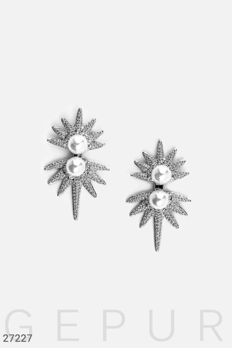 Регулируемые серьги-подвески, украшенные фианитами и искусственным жемчугом.