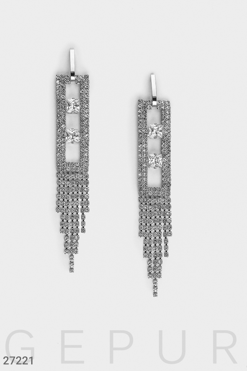 Серьги-шандельеры прямоугольной формы с крупными искусственными камнями и сверкающими подвесками.