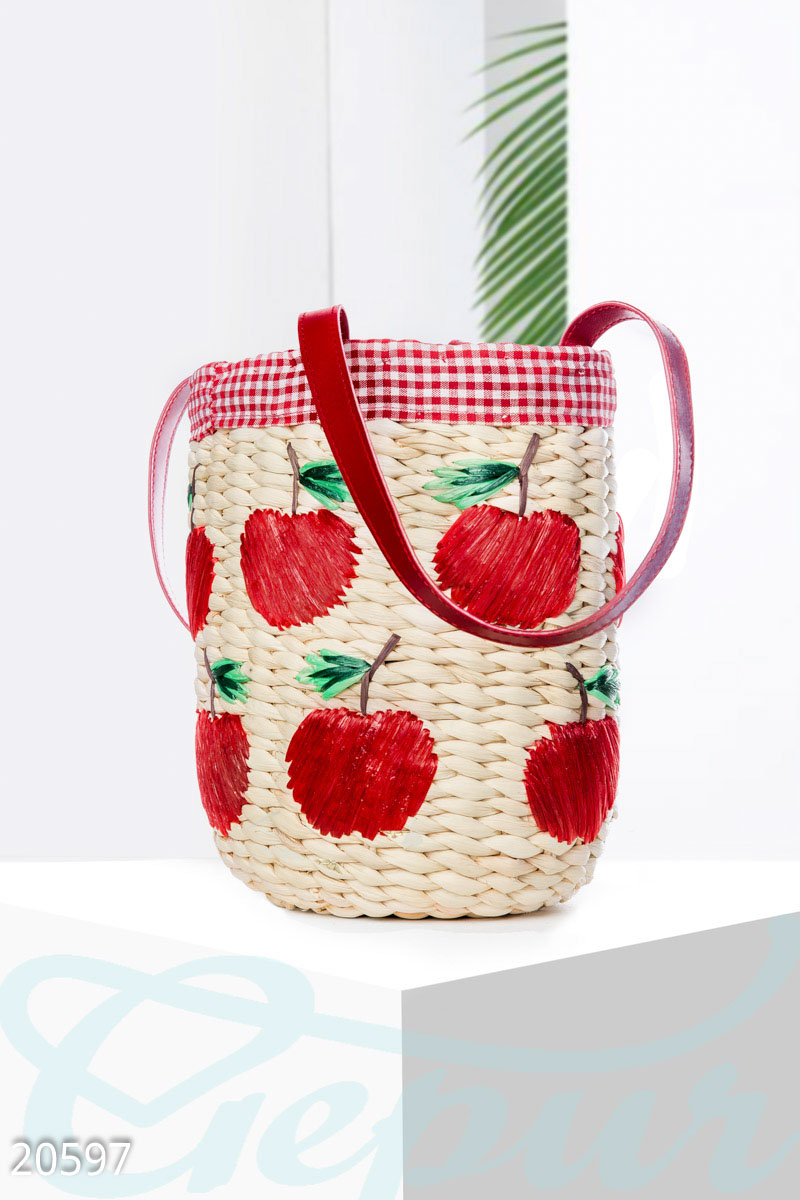 Соломенная сумка-бочонок с яркой вышивкой, хлопковым подкладом, фиксатором на кулиске.