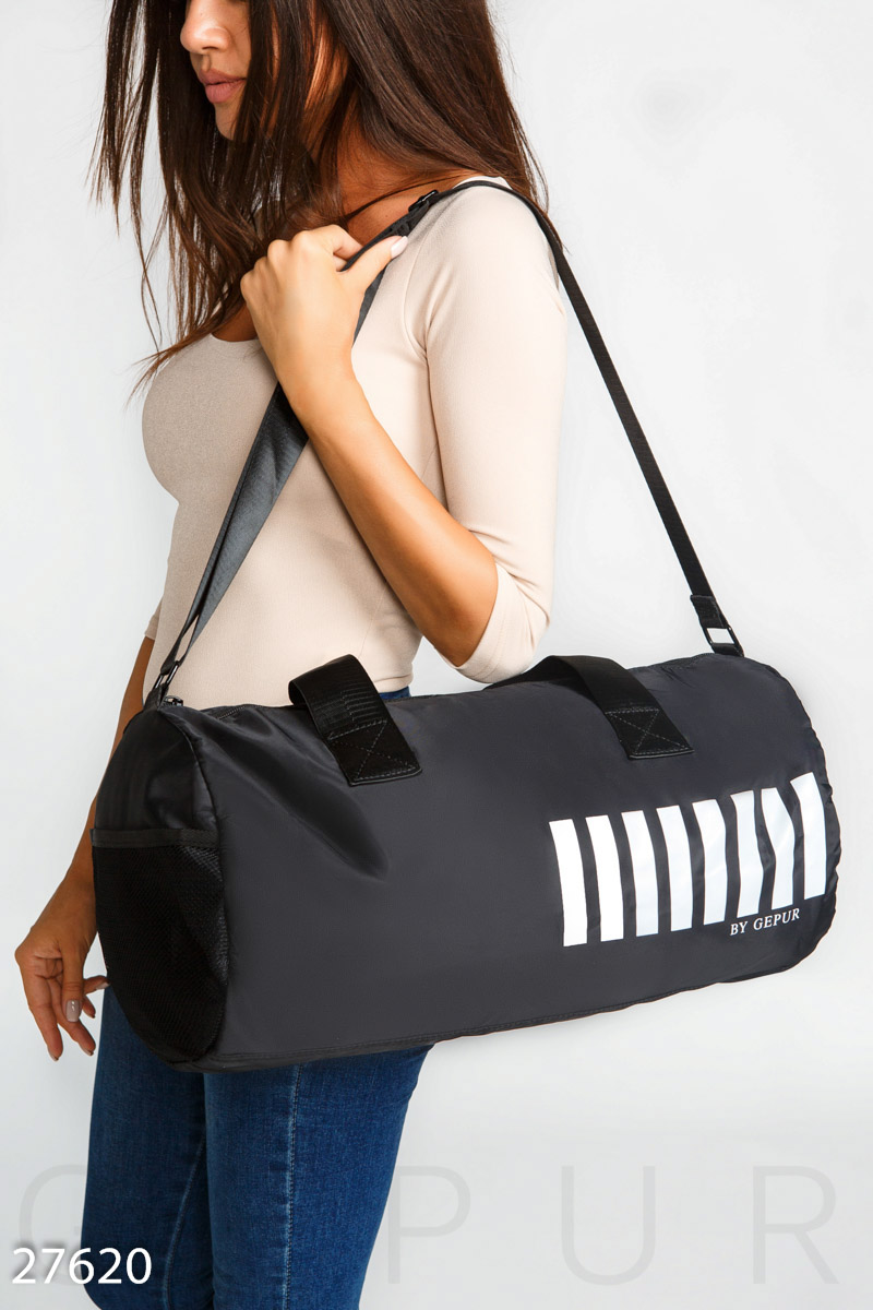 Вместительная женская сумка для фитнеса с двумя удобными ручками, широким плечевым ремешком с регулятором длины и двумя боковыми карманами на сетке.