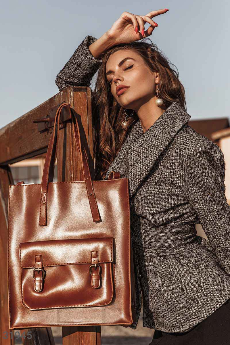 Большая вместительная сумка шоколадного цвета с регулируемыми ручками и длинной пристегивающейся лямкой: одно вместительное отделение, объемный карман спереди на магнитных кнопках, декоративных пряжках и один наружный карман.