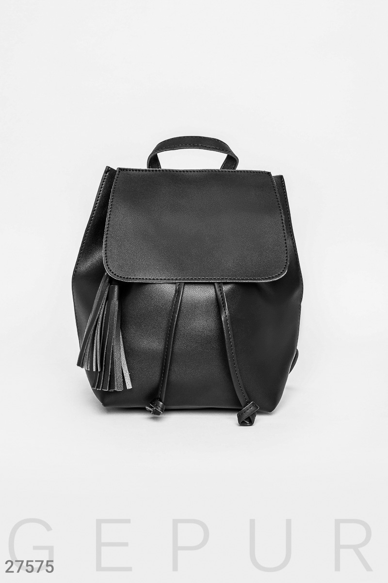Городской рюкзак, выполненный из эко-кожи: клапан-застежка на магнитной кнопке и кулиске, декорированной аккуратными кисточками, регулируемые лямки.