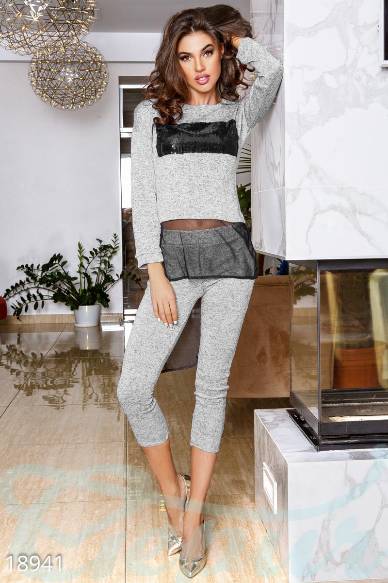 Стильный трикотажный костюм, украшенный контрастными акцентами: укороченная толстовка с пришивным подолом из прозрачной сетки и нашивкой пайетками на груди, бриджи средней посадки с эластичной вставкой на поясе.