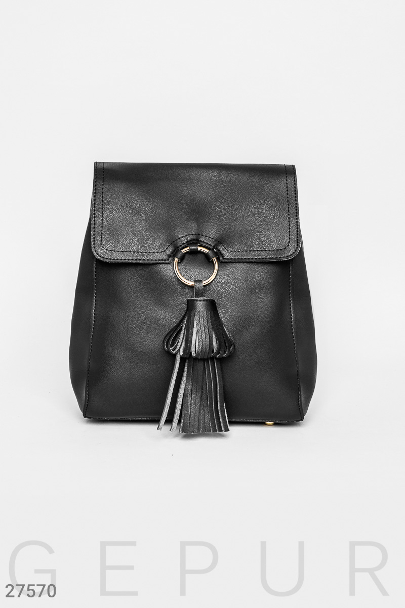Повседневная сумка-рюкзак из эко-кожи: застежка-клапан на магнитной кнопке с молнией и декоративным кольцом с массивной кисточкой, небольшой прорезной карман на молнии, регулируемые лямки.