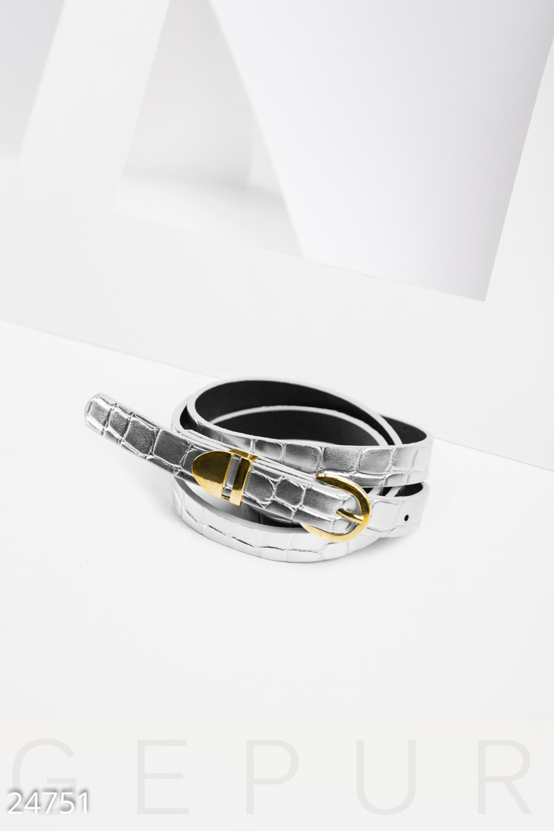 Тонкий ремень из фактурной эко-кожи, дополненный на пряжке стильными металлическими вставками.