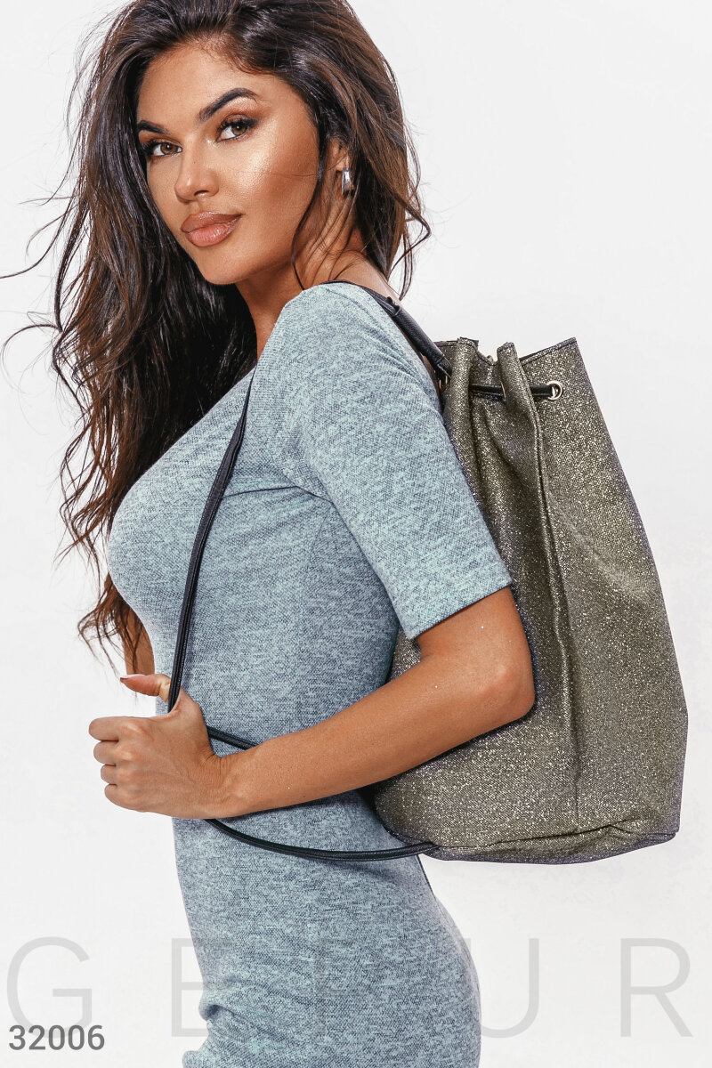 Серебристый рюкзак с мерцающим эффектом и брендированной нашивкой спереди: сборка по верху, нерегулируемые лямки из эко-кожи, одно вместительное отделение без карманов.