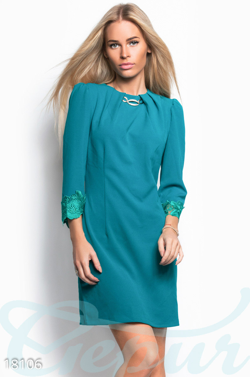 Короткое приталенное платье, выполненное из фактурной ткани: аккуратный круглый вырез с защипами и металлическим декором, рукав-фонарик с длиной 7/8 и кружевной отделкой на манжете.