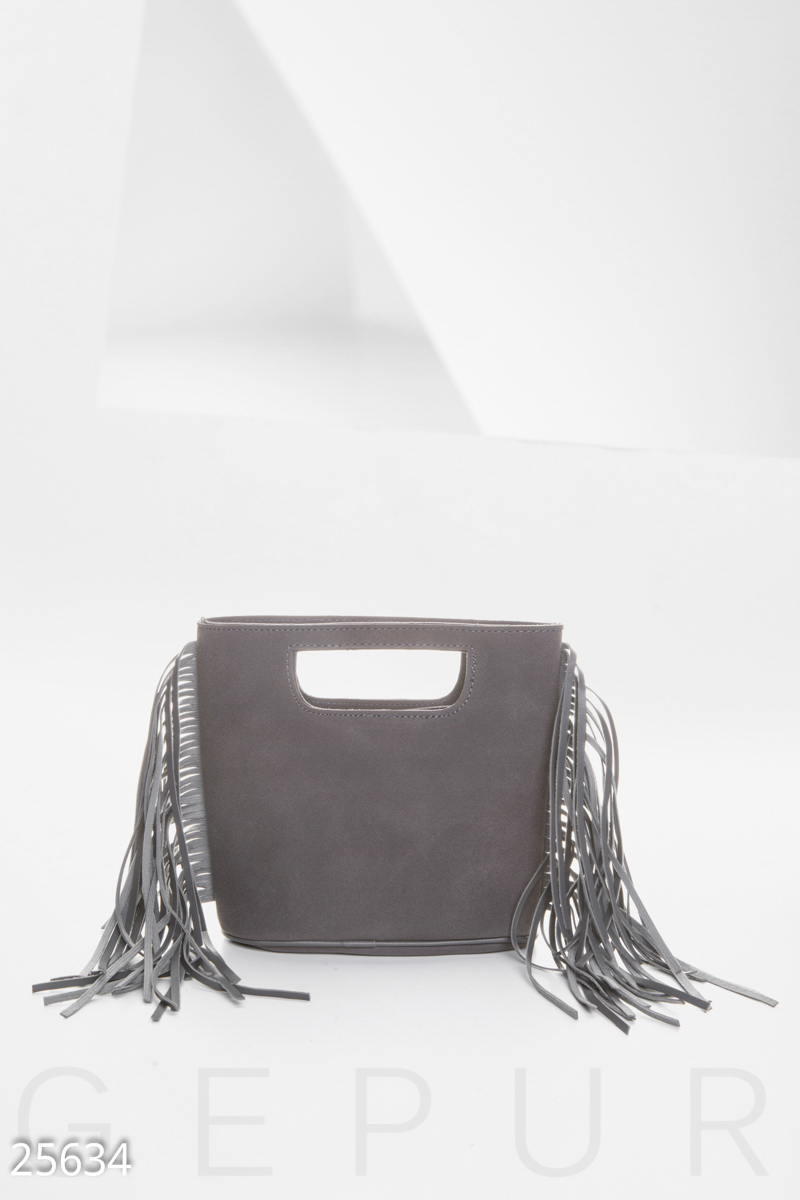 Лаконичная сумка-мини из эко-замши, со съемным плечевым ремешком и бахромой по бокам.
