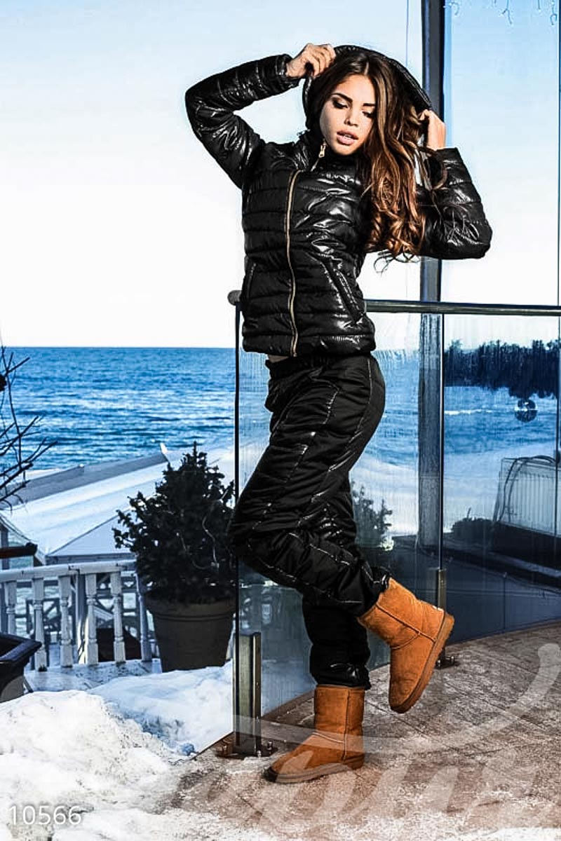 Теплый зимний костюм-двойка, выполненный из стеганой плащевой ткани: куртка на молнии со съемным капюшоном и карманами по бокам брюки средней посадки с прорезными карманами и контрастными лампасами.